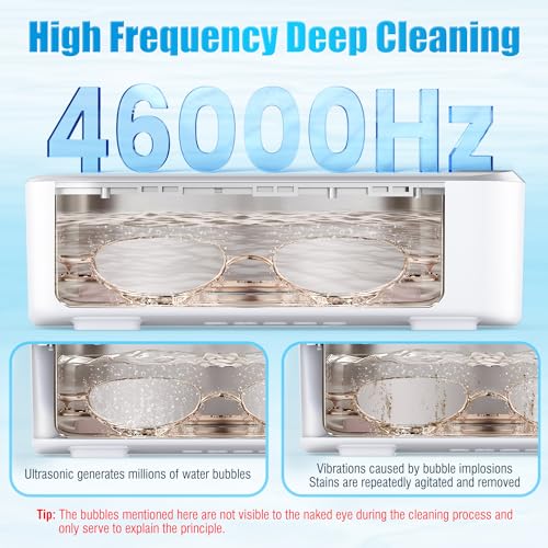 Easy to Use: This glasses cleaner machine is simple and easy to operate, just press the touch button of this ultrasonic cleaner to start, and it will automatically turn off when completed. 3-minute mode cleans uncoated eyeglasses, dentures and orthodontic retainers, and the 5-minute depth mode meets the cleaning requirements of jewelry and waterproof watches.
